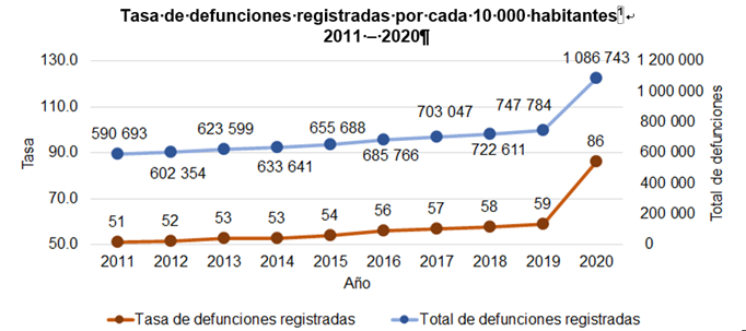 En 2020 se calculaba que habría un total de 749 mil 496 defunciones en el país; sin embargo, derivado principalmente de la pandemia, el número de personas fallecidas ascendió a un millón 076 mil 417, lo que significa un exceso de mortalidad de 326 mil 921, equivalente al 43.6 por ciento, y en la que en gran mayoría fueron quienes adquirieron el virus SARS-CoV-2 (COVID-19) que afectó su salud y ocasionó que perdieran la vida.