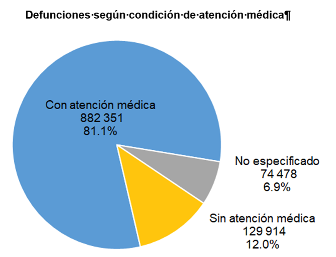 Con respecto a la atención médica proporcionada a los fallecidos, el Inegi destacó que 81.1 por ciento (882 mil 351 personas) de ellos la recibieron, lo que refleja un aumento de 2 por ciento con respecto a 2019, en tanto que 12 por ciento (129 mil 914 personas) no la tuvo y en 6.9 por ciento (74 mil 478 personas) no se especificaron.