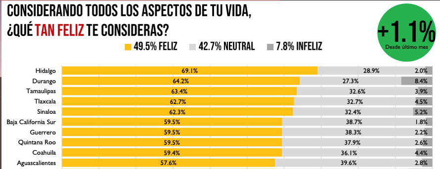 Entre los estados más felices, en primer lugar, se ubicó Hidalgo, debido a que 7 de cada 10 hidalguenses opinan sentirse felices con todos los aspectos de su vida y en el último esta Nayarit. Ciudad de México está en el lugar 23.