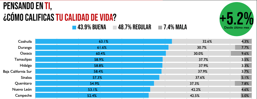 Respecto a las entidades con mejor calidad de vida, en primer lugar está Coahuila, ya que 3 de cada 5 ciudadanos consideran que su calidad de vida es buena y en última posición se ubica Chiapas. Ciudad de México está en el nivel 21.