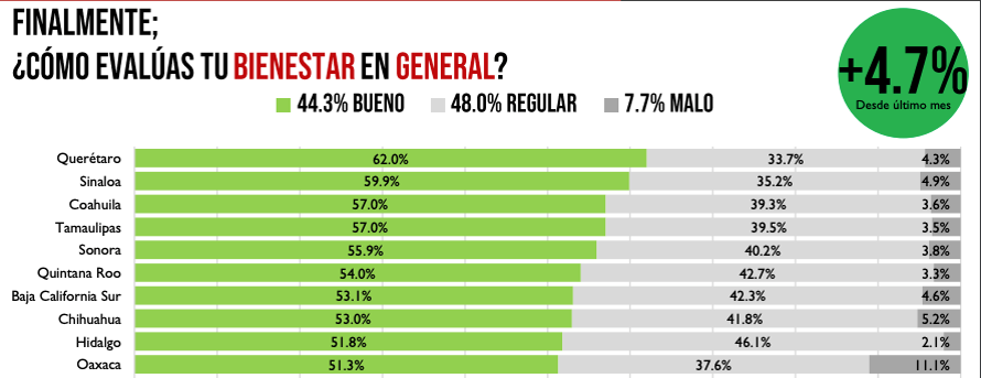 En bienestar, el estado con los mayores índices es Querétaro, pues 3 de cada 5 habitantes perciben que tienen un buen bienestar en general y la entidad con los números más bajos fue Zacatecas. Ciudad de México está en el lugar 25.