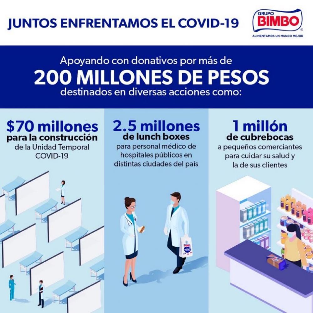 En ese eje de ayuda, Bimbo también donará 2.5 millones de box lunches a personal médico que se encuentra trabajando incansablemente. El alimento se va a distribuir en hospitales públicos de diversas zonas de la República Mexicana. También se entregarán donativos a la Fundación Mexicana para la Salud.
